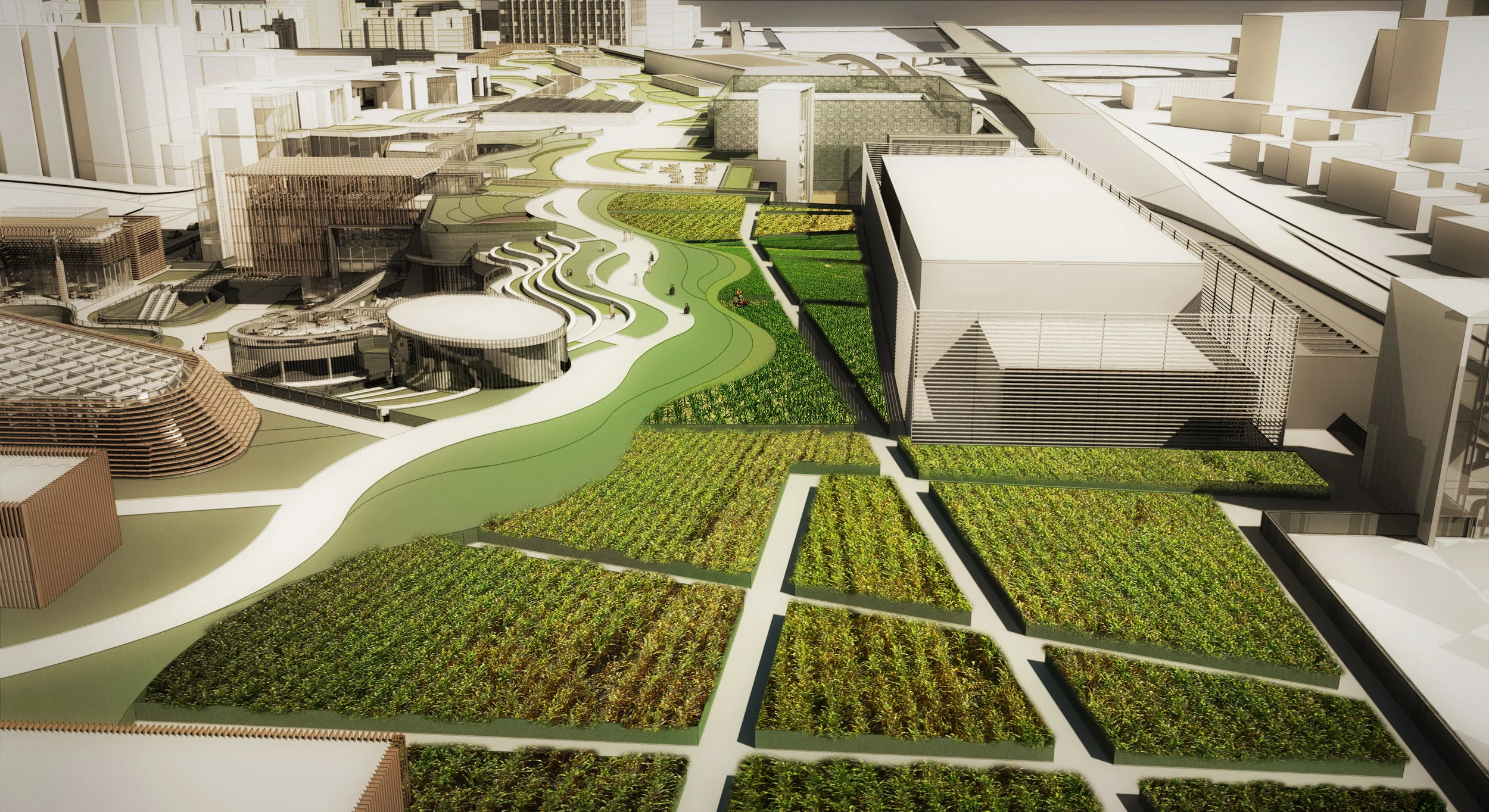 Retail, restaurant, entertainment, office, residential, park, urban farm