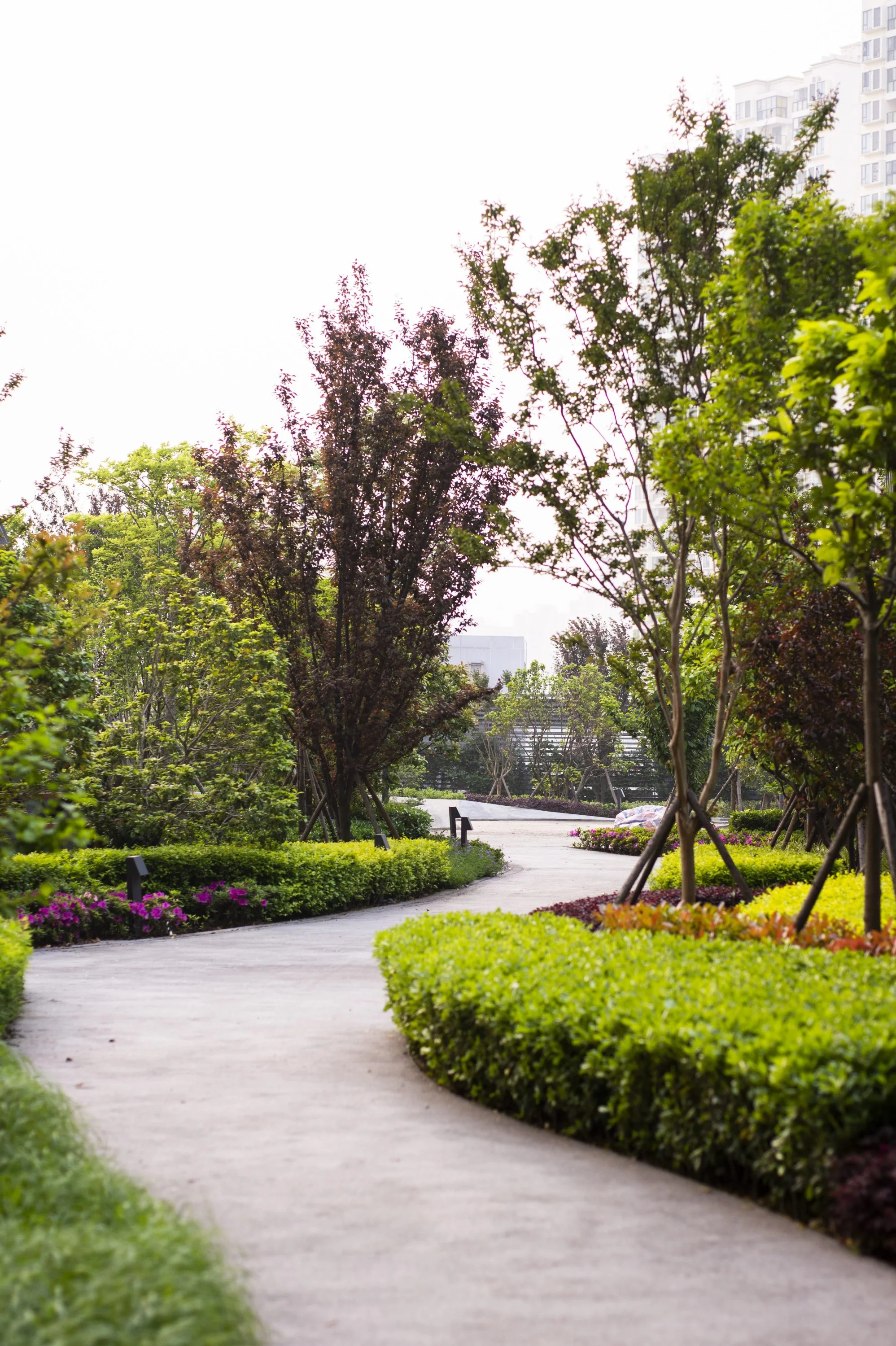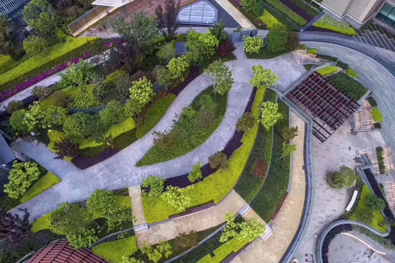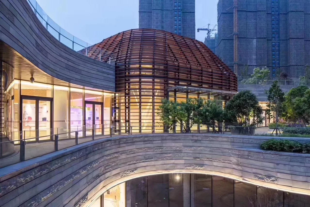 At the project’s exterior, tree-lined terraces ascend from the street level, pulling visitors through the project’s exterior spaces and onto the outdoor food and beverage platform. A rhythm of warm, buff colored stone buildings develop a repetition along Zhongshan Blvd. as flagship anchors capture the streetscape beyond. This repetition of shapes and color create a modulation that speaks directly to the human-scale of the streetscape. Punctuations in the soft stone façade begin to reveal gardens and cascading terraces that lead the visitor to the project’s upper levels. Contrasting stone, dark green in color and varied in textures, characterize this level and allows for a more organic, park-like flow of shapes and surfaces.